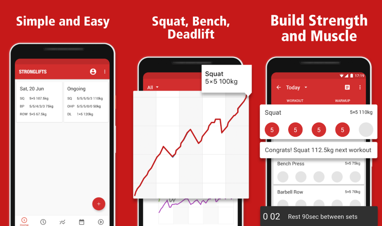 StrongLifts хорошо подойдёт для новичков и атлетов, вернувшихся в силовой спорт после долгого перерыва. Её главное достоинство — простота. В основе стоит — одноимённая программа силовых тренировок, которая представляет из себя пять подходов по пять повторений из пяти упражнений с произвольным весом. Она включает в себя жим штанги лёжа на горизонтальной скамье, жим штанги над головой стоя, приседания со штангой, становая тяга, тяга штанги к поясу в наклоне. Получается всего три 45-минутных тренировок в неделю.