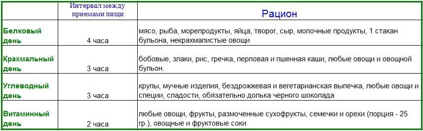 90 дней разбивается на три повторяющихся фазы: 7 периодов по 4 дня (в неизменном порядке – белковый, крахмальный, углеводный и витаминный), что в сумме составляет 28 дней. На следующие сутки следует разгрузочный питьевой день, когда разрешено употреблять только воду.