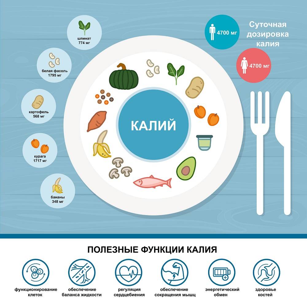 Калий поддерживает достаточный уровень натрия, нормальный кислотно-щелочной баланс и насыщение клеток жидкостью, участвует в образовании гликогена — энергии в чистом виде. За счет этого металл обеспечивает нормальное внутриклеточное давление, проводимость нервных импульсов, способствует здоровому функционированию почек, очищению от шлаков. Калий поддерживает умственную и физическую работоспособность.