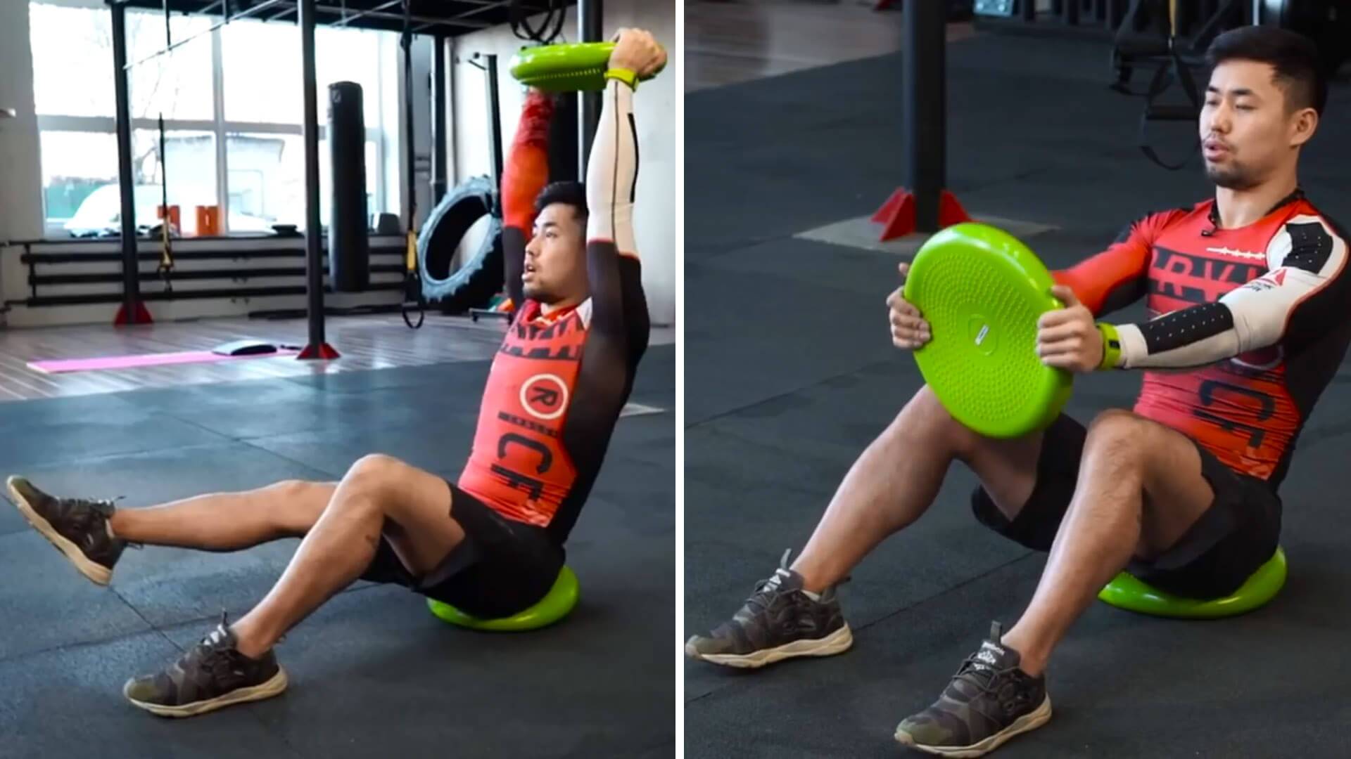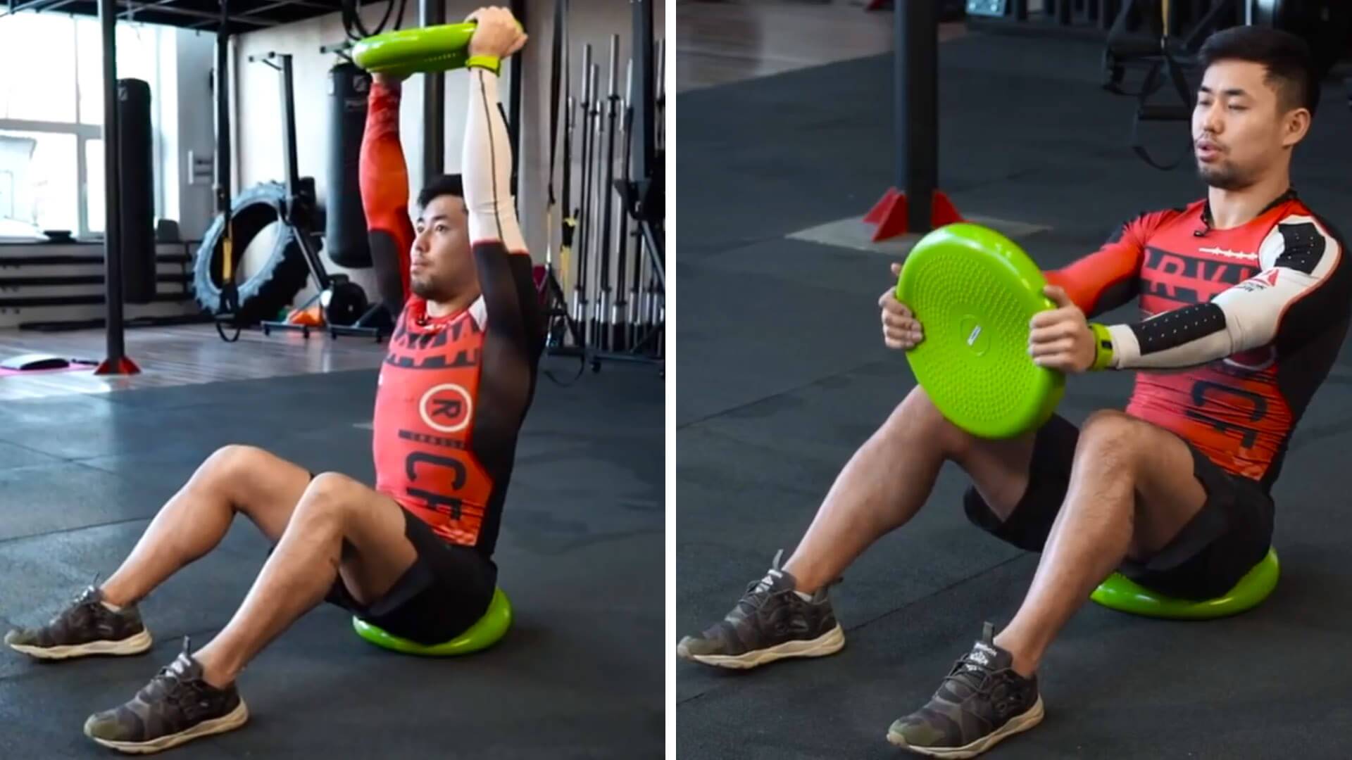 - Скручивание. Исходная позиция: необходимо сесть на диск, подтягивая мышцы спины и пресс. Ноги располагаются на ширине плеч, руки располагаются вдоль тела. Правым плечо повернуть вперед, одновременно подняв левую ступню на носок. После чего необходимо повернуть шею направо, и глядя на правое плечо, повторить упражнение уже с левым плечом.