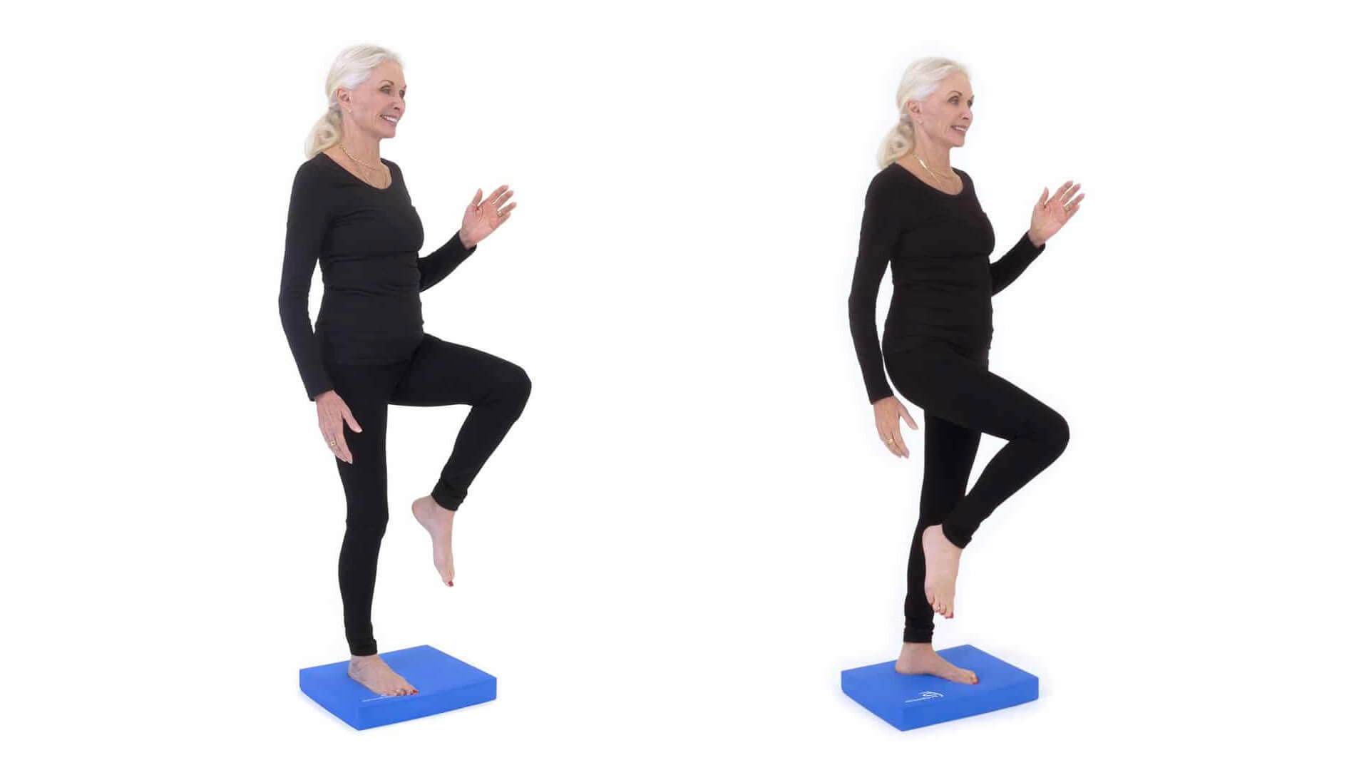 - Затем оторвите одну стопу и поднимите бедро вверх, согнув ногу в колене. Держите руки перед собой или на поясе.