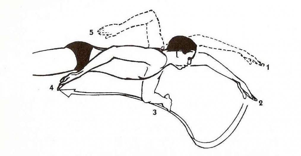 При этом тазом пересекается линия воды, благодаря чему по телу как бы проходит волна. На следующей стадии происходит подъем плеч вверх, из-за чего бедра остаются внизу.