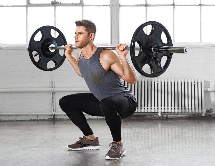 Классические приседания: ноги на ширине плеч, штанга зажата в руках за головой на уровне пятого шейного позвонка или чуть ниже. Нельзя укладывать гриф на шею – это распространенная ошибка новичков. Отклониться назад тазом, как будто человек собирается присесть на стоящий сзади стул. Выполнить приседание по параллели с полом, затем с идеально ровной спиной вернуться в исходное положение.