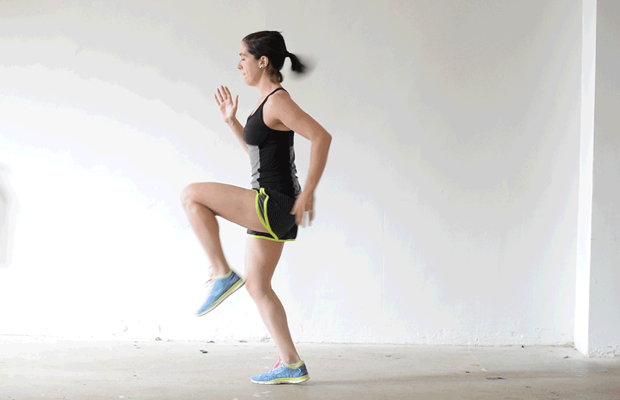 Простой бег без подскоков: ногу необходимо ставить с пятки на носочек. Старайтесь чередовать ноги как можно быстрее, не выводя коленей выше параллели с полом. Живот подтянут, корпус выпрямлен, руки или согнуты в локтях и прижаты к корпусу, или как при обычном беге.