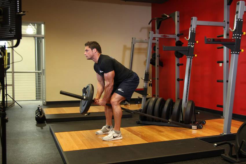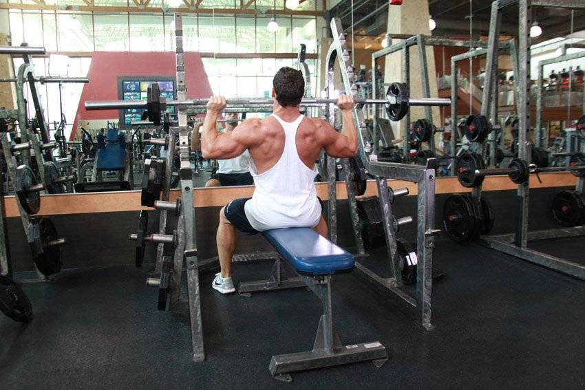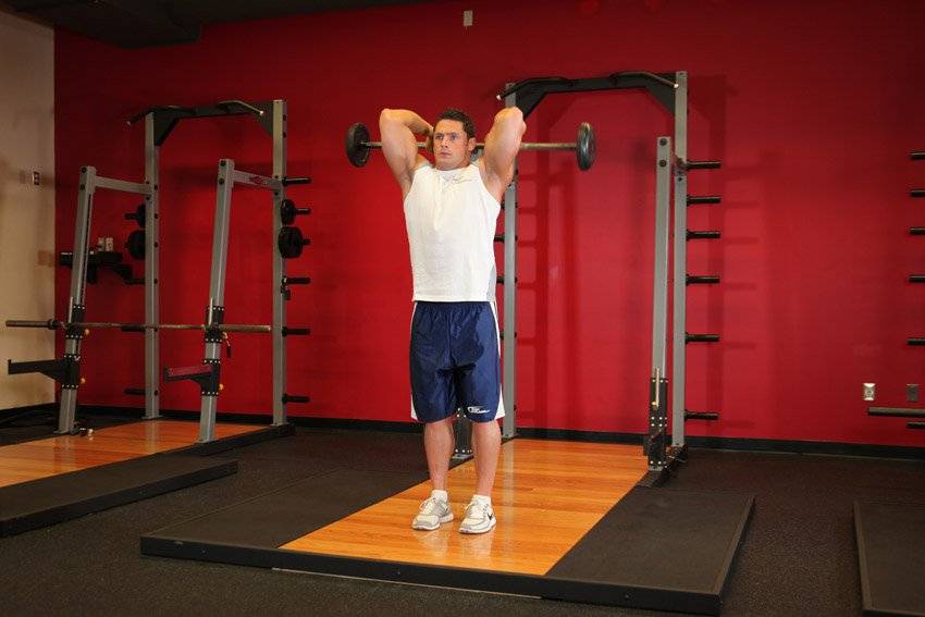 Выполнение: гриф штанги лежит на плечах, за головой. Локти под грифом, в верхней позиции гриф держим строго над головой.