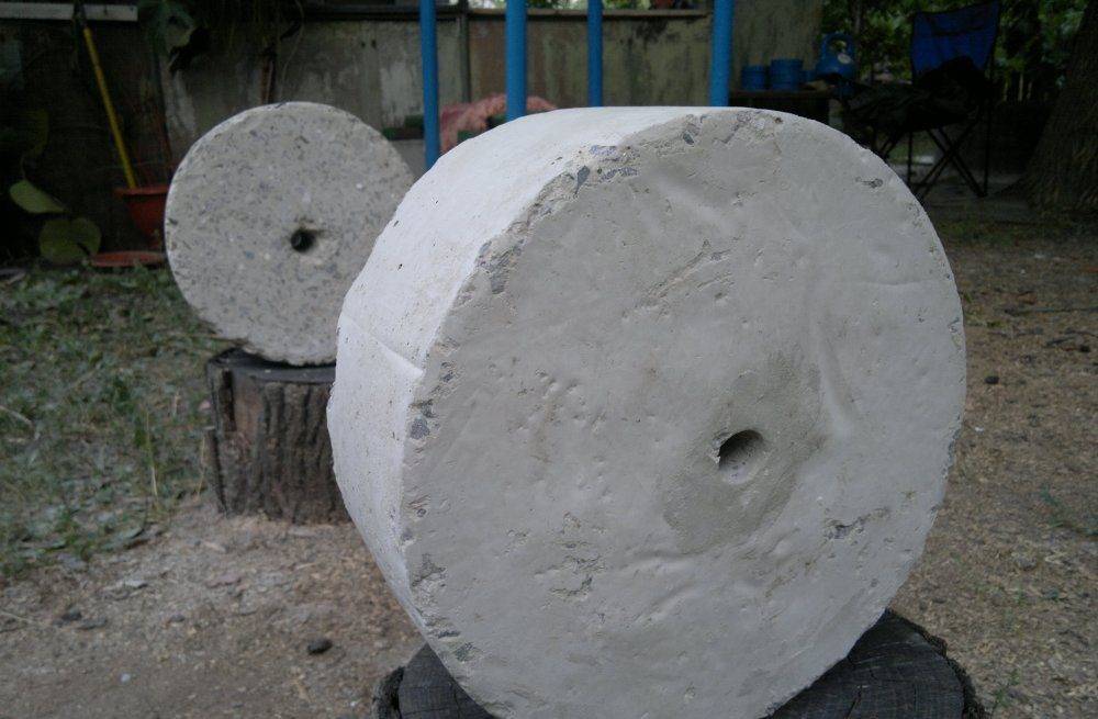 - Когда бетон затвердеет, блины вынимают из формы, взвешивают. Для корректировки веса излишки материала спиливают болгаркой.