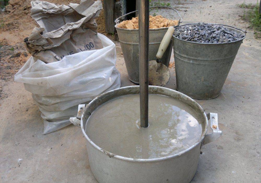 - В ведре или другой емкости замешивают раствор, состоящий из 7 кг цемента, 8 кг щебенки, 10 кг песка, 3,5 л воды.