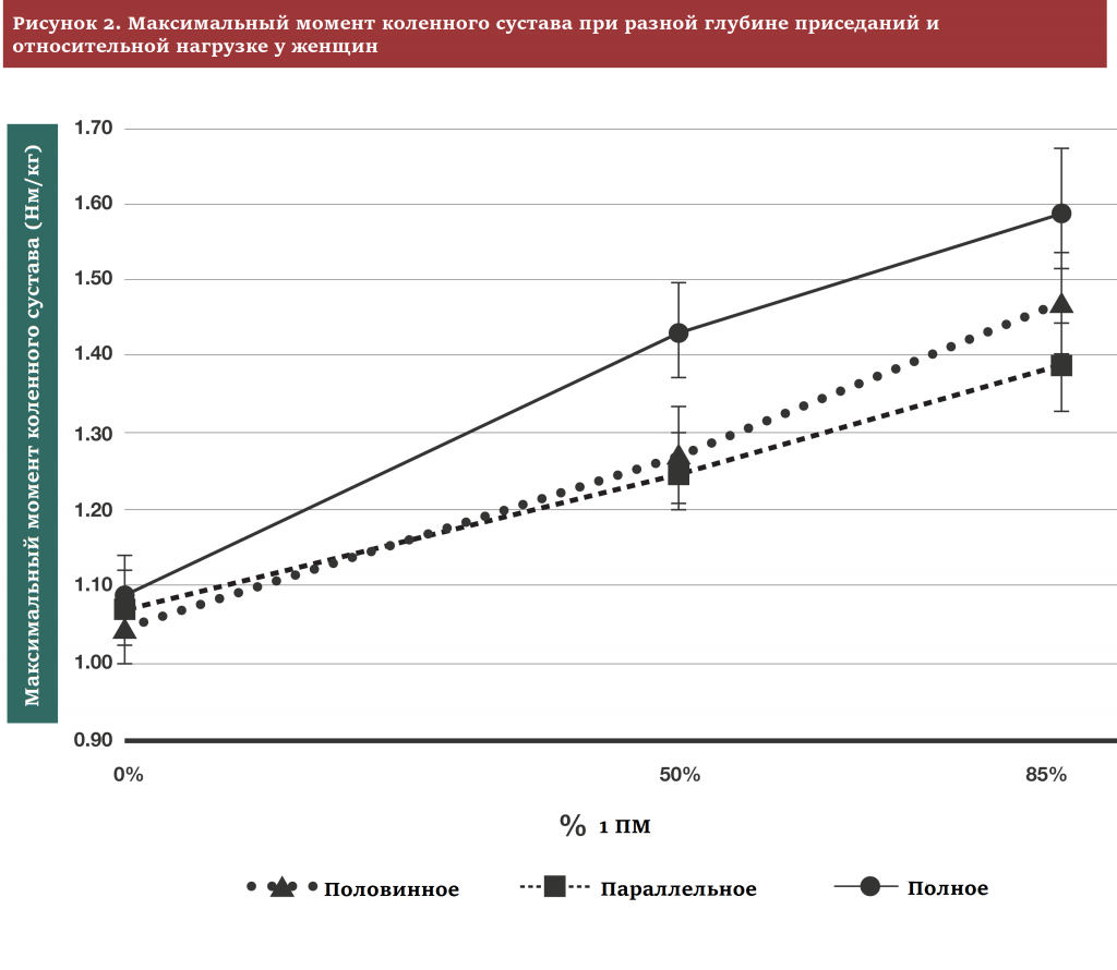 Во время приседаний без нагрузки увеличение глубины приседа не влияет на максимальный момент коленного сустава. При 50% 1ПМ максимальный момент коленного сустава существенно выше при полном приседании, чем при параллельном или половинном, несмотря на то, что абсолютная нагрузка ниже. При нагрузке 85% 1ПМ максимальный момент при полном приседании значительно больше, чем при параллельном, но несущественно отличается от значения при параллельном приседании (рис. 2).