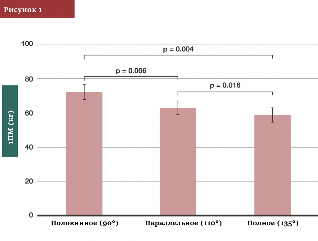 Как и следовало ожидать, чем глубже приседание, тем меньше 1ПМ. Для половинного приседания его средняя величина составила 72,37 кг, для параллельного — 63,13 кг и для полного — 58,85 кг (рис. 1).