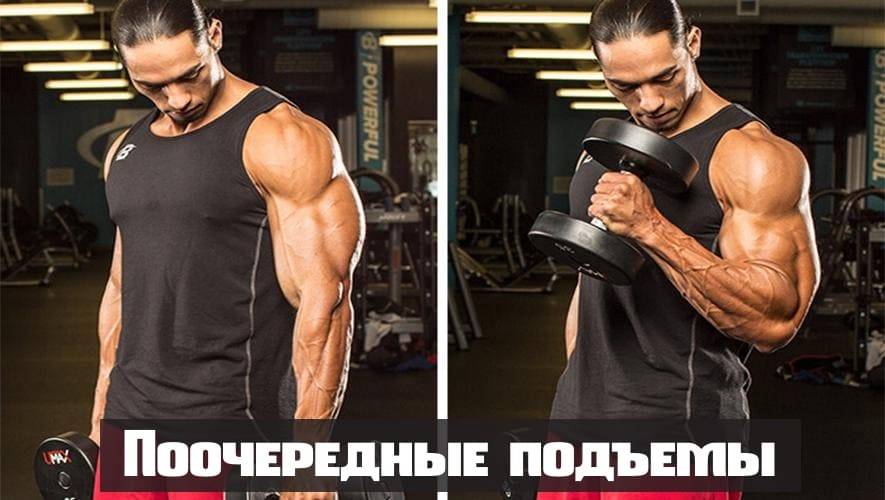 - Делаем поочередно. Поднимая правую руку, потом после опускания левую и так и чередуем. Тут главное стараться постоянно держать бицепс в напряжении в неработающей руке.