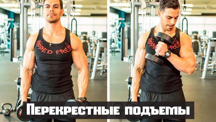 Это вариант наиболее сложный. Для того чтобы его сделать, нам надо вывести плечи немного вперед. А гантели развернуть в бронированную позицию(ладонями назад). Движение мы выполняем такое же, как и в классическом варианте. Только гантель направляется вдоль груди к противоположному плечу. Что нам это даст? Так как мы развернем гантели, наша длинная головка станет не совсем в удобное для не положение. Следовательно, она потеряет часть силовой нагрузки. Вследствие чего, большую часть работы начнет выполнять брахиалис. Конечно все это небольшое смещение, но лично я, только в перекрестных подъемах ощущаю как работает моя плечевая мышца. Советую и вам попробовать такой вариант и понять работает он для вас или нет. Выполнять его можно как поочередно, так и двумя руками одновременно. Изменяется только амплитуда движения. То есть поднимая гантель одной рукой, она будет больше.