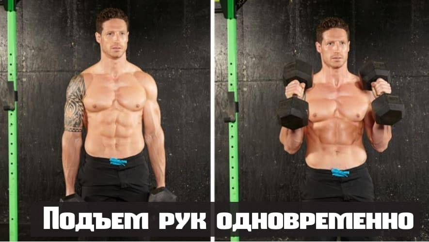 Данный вариант, поможет проработать нам две руки за более короткий временный промежуток. Так же, выполняя одновременные подъемы проще удерживать напряжение в прессе. Так как не будет никакого перекоса. Это в разы повысит нашу устойчивость. А значит мы можем взять вес, немного больше(без фанатизма). Но к сожалению сложнее будет фокусироваться на работе целевых мышц, особенно новичкам. Ведь у них еще не развита нейромышечная связь.