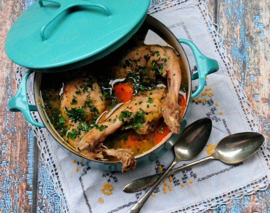 Понадобится (на 2 порции): 400 г мяса кролика, 4 зубчика чеснока, лавровый лист, стебель сельдерея, 1 морковь, 2 помидора, 1 луковица, несколько горошин черного перца, по 1 столовой ложке сметаны и томатного соуса, соль по вкусу.