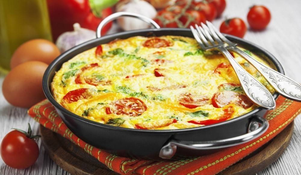 Понадобится: (на 1 порцию): 2 куриных яйца, 1 помидор, 1 маленькая луковица, 1 болгарский перец, 1 столовая ложка оливкового масла, немного рубленой зелени.