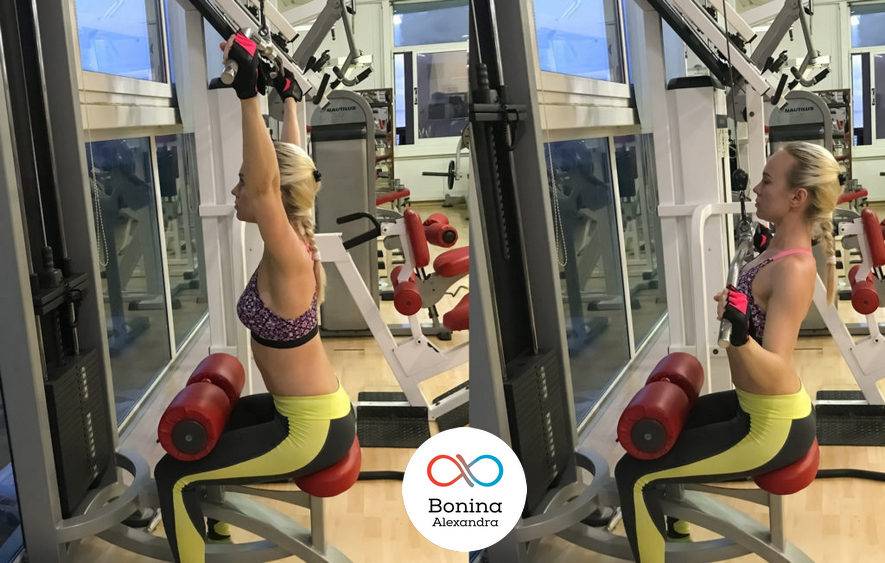 По механизму работы, это движение очень схоже с подтягиваниями. Только здесь, благодаря упору ног в валики, гораздо проще работать даже с весом, аналогичным своему. Если вам тяжело подтягиваться, то на первых порах занимайтесь в блочном тренажере.