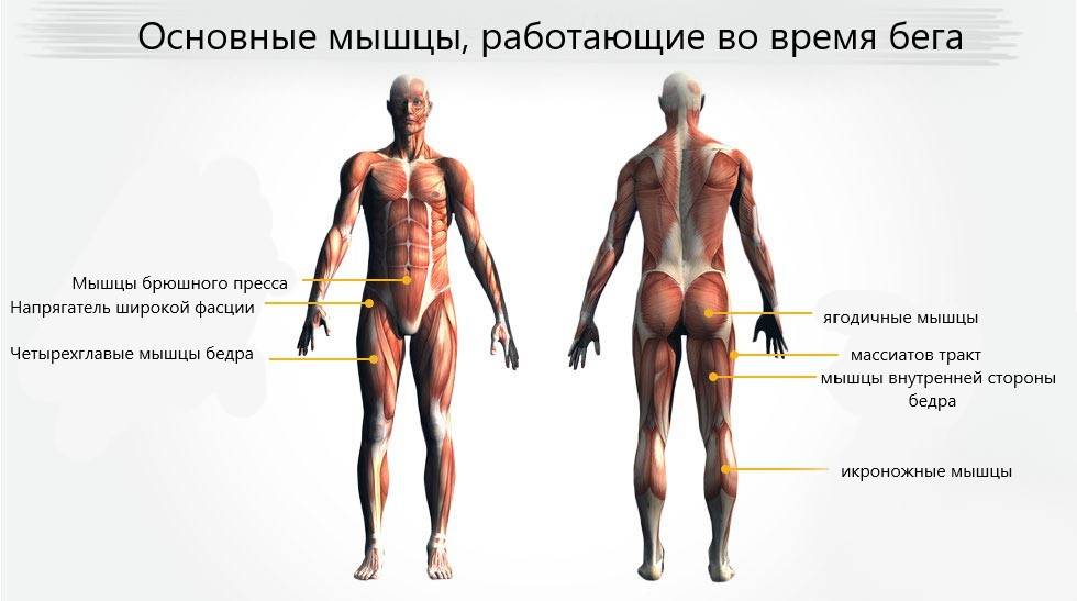 При беге тренируются мышцы нижних конечностей, а силовые нагрузки на спину приводят к укреплению мышечного каркаса туловища.