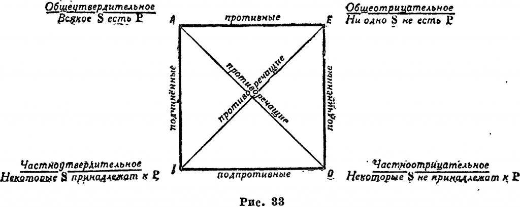 Эти положения стали основой диаграммы, созданной Боэцием и используемой средневековыми логиками для классификации логических отношений. Предложения помещаются в четыре угла квадрата, а отношения представлены в виде линий, нарисованных между ними, из чего последовательно получается «Логический квадрат».