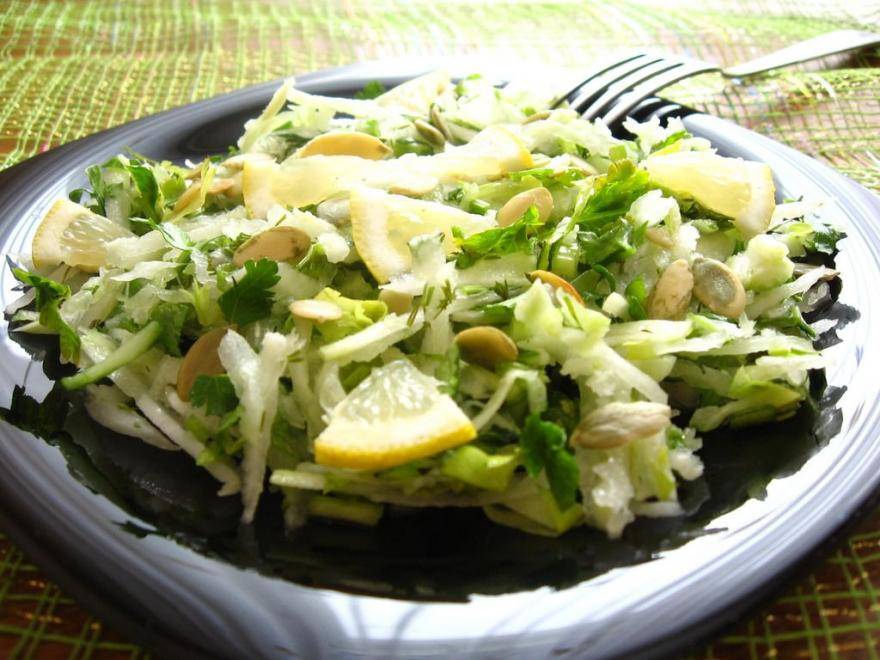 3-ий приём пищи: 200 граммов овощного салата (капуста, морковь, листовой салат, сельдерей), кусочек хлеба с отрубями или цельнозернового хлеба.