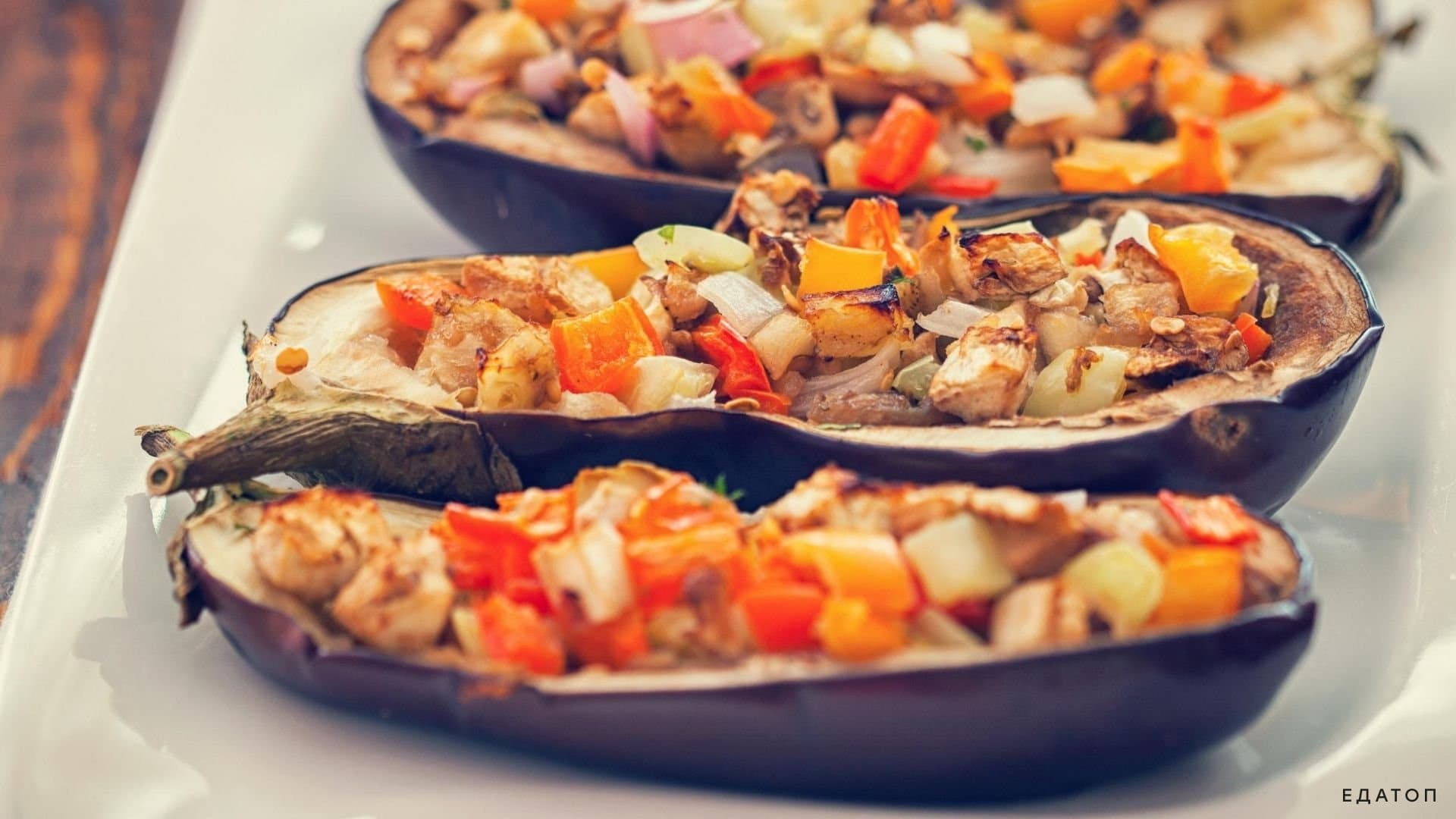 Яркое блюдо “Лодочки из баклажанов с грибами”.