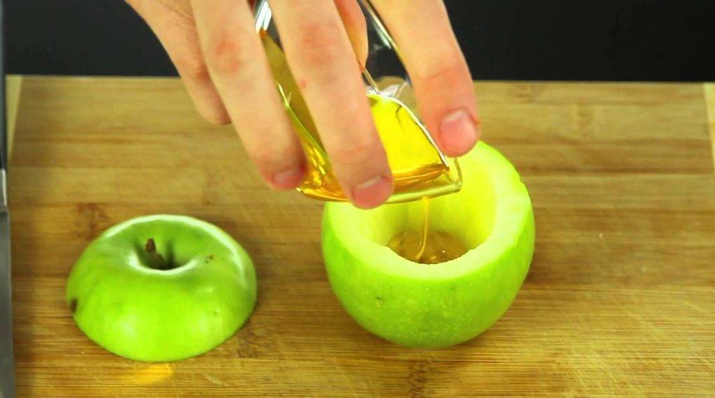 Для этого яблоко разрезается пополам, из него удаляется сердцевина, а вместо нее заливается мед. Можно добавить орешки или курагу, а сверху посыпать корицей, сбрызнуть лимонным соком.