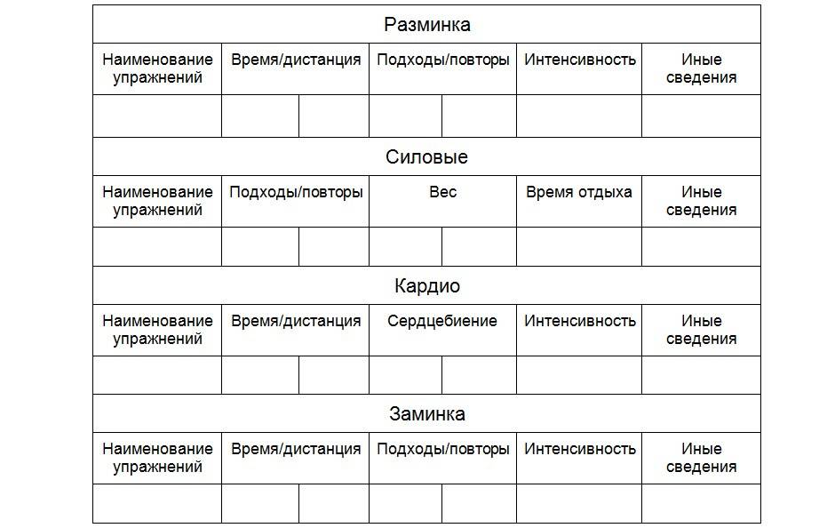 Например, шаблон дневника тренировок может выглядеть так: