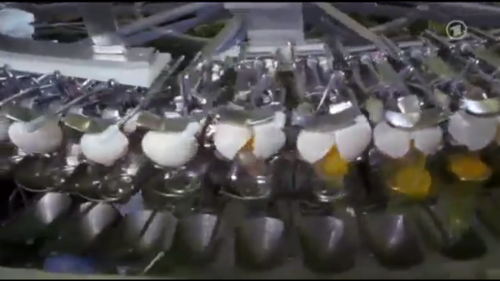 Берут обычные куриные яйца и «заряжают» ими конвейер. Почти все операции дальше проводятся в автоматическом режиме.