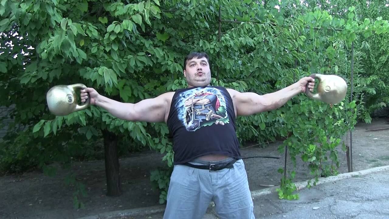 Большой популярностью среди публики пользуется знаменитое упражнение «Крест Халаджи». Дмитрий в положении стоя разводит в стороны прямые руки, удерживая в каждой гирю по 16 кг.