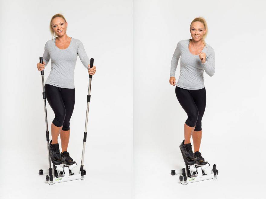Степпер. Данная модель достаточна компактна, платформа с педалями может быть дополнительно оборудована поручнями и эспандером. Тогда работают не только мыщцы ног, но и прорабатывается верхняя часть туловища — пресс, спина, бицепсы. Единственные минусы степпера — при излишнем весе увеличивается нагрузка на коленные суставы и задействовано небольшое количество мышц.