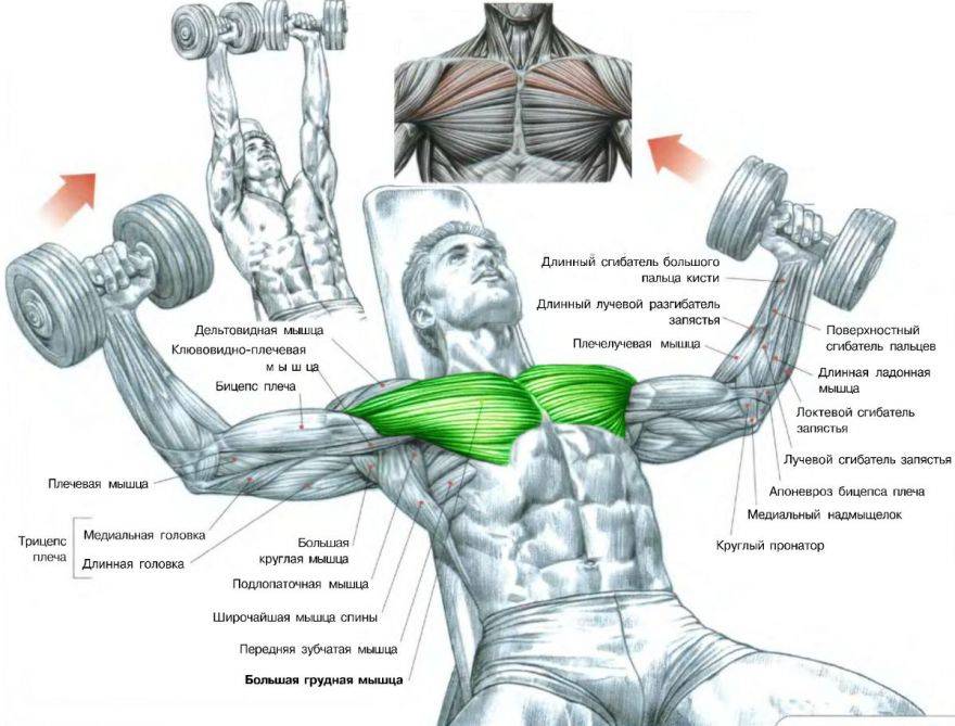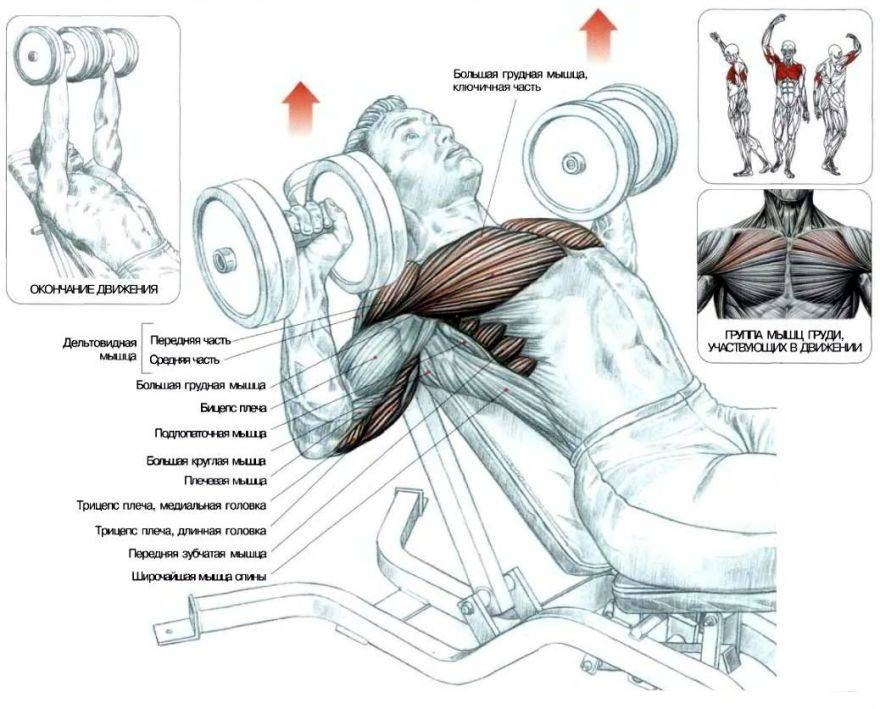 - Разведение рук с гантелями в стороны в положении лёжа на скамье под уклоном. Выполняется 3-4 подхода по 12-15 раз.
