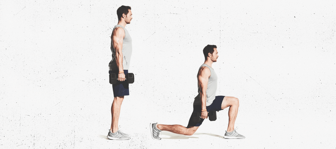 Начнем с исходного положения: заранее приготовь две гантели и встань ровно между ними, стопы держи на ширине бедер — это поможет тебе делать правильные выпады. Затем медленно согни ноги и возьми гантели в каждую руку, после выпрямись, но следи, чтобы гантели были в руках на одном уровне. Теперь делай выпад ногой вперед с максимальной амплитудой, вес тела полностью переноси на ногу, которую ставишь вперед, спина на протяжении всего выполнения должна оставаться прямой.