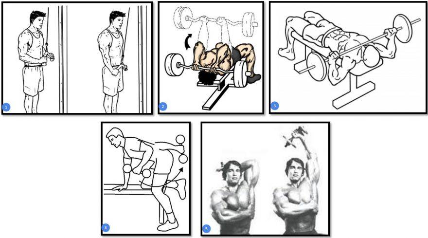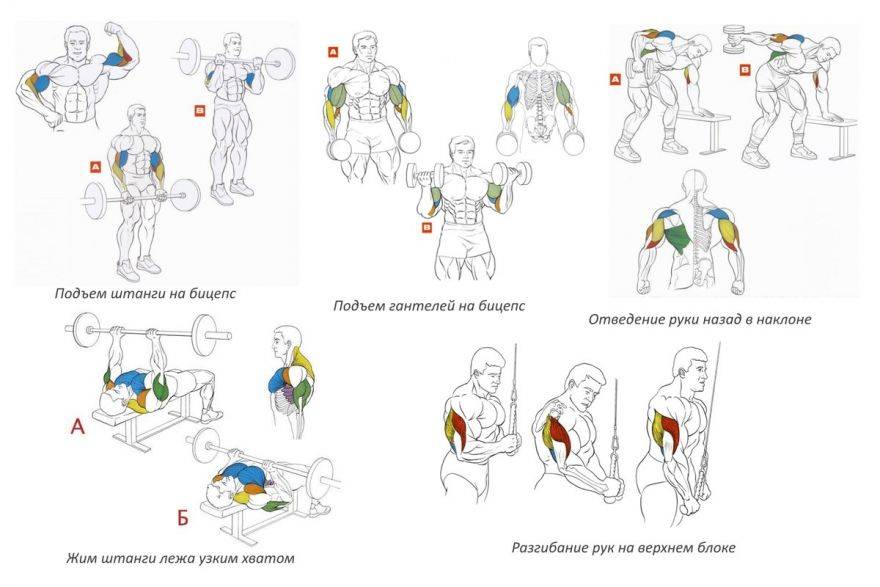 Не следует обделять вниманием и упражнения для проработки малых групп, которые являются условно базовыми, — молотки и подъем штанги на проработку бицепса, жимы французский и с узким хватом