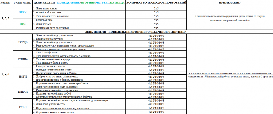 Первая цифра подходы, вторая повторения. То есть, например, 3х12 означает, 3 подхода по 12 повторений, кроме того, надо подобрать рабочий вес в упражнениях, делается это очень просто. Пред началом выполнения данной тренировочной программы, сделайте проходку, то есть, поднимите максимальный вес, в трех основных, базовых упражнениях, в остальных, вспомогательных упражнениях, необязательно зацикливаться на рабочих весах, поднимайте вес такой, чтобы можно было сделать «чисто».