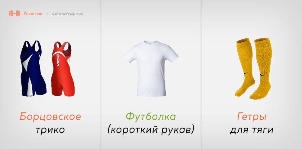 На соревнованиях по пауэрлифитнгу вы обязательно должны иметь трико, футболку с коротким рукавом и гетры.