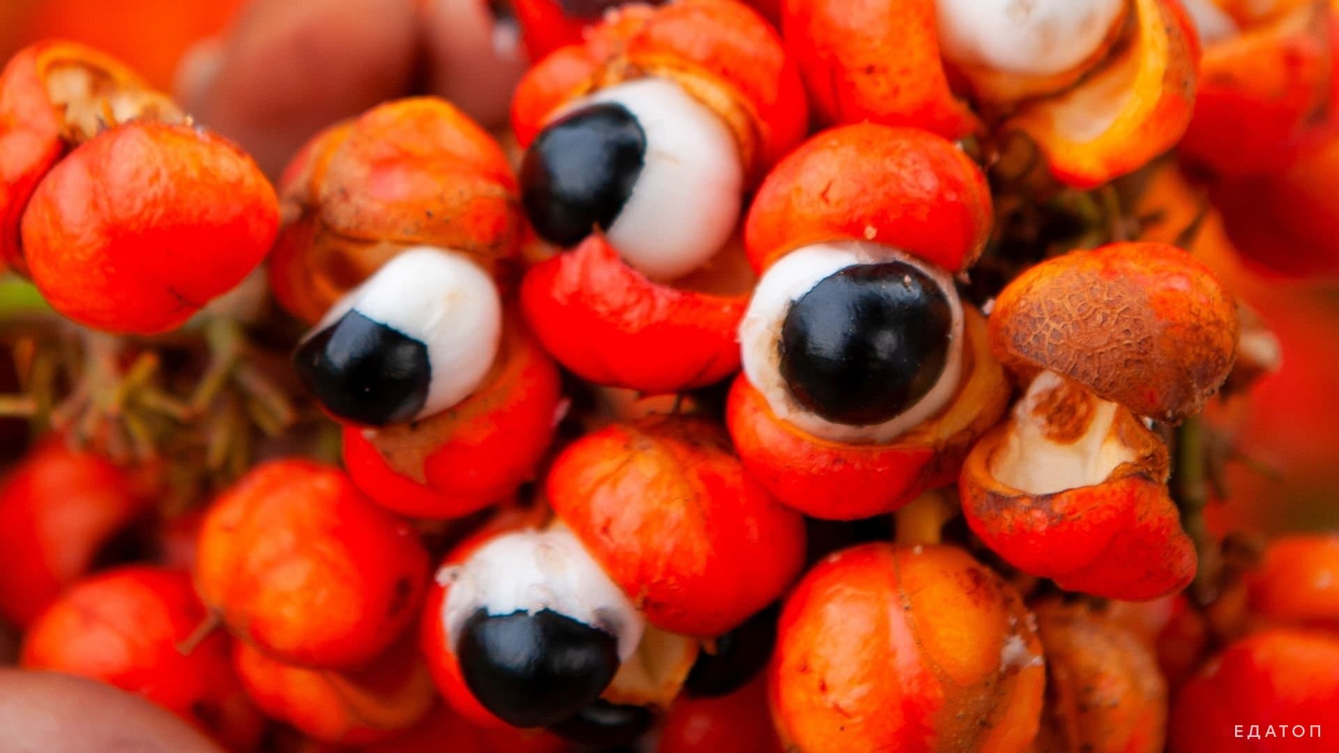 Плоды ярко красного цвета снаружи с белой мякотью внутри. По размеру как кофейные зерна. После растрескивания открываются от 1 до 3 семян черного цвета. Внешне семена напоминают глаз, по бокам покрытый белой пленкой, которая легко отделяется после сушки.