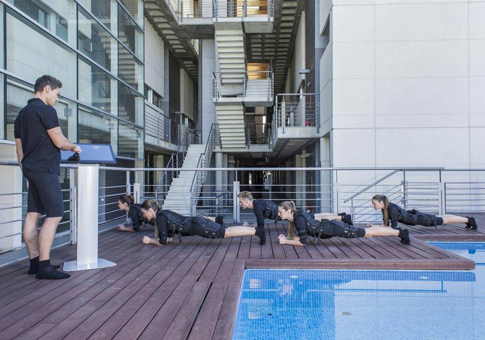 Каждая тренировка проходит под руководством индивидуального тренера. Перед началом занятия человек надевает специальный костюм с электродами. Костюм изготовлен из эластичной антибактериальной ткани, которая комфортно прилегает к телу во время тренировки, не ограничивая движений. Тренер подбирает костюм по размеру так, чтобы электроды, установленные на костюме, максимально плотно прилегали к телу, тем самым обеспечивая максимальную эффективность от тренировки. С помощью планшета, являющегося своеобразным пультом управления к костюму, специалист настраивает силу электроимпульса в разных зонах тела. Далее импульсы передаются к основным мышцам живота, груди, спины, рук, ног и ягодиц, вызывая их попеременное сокращение и расслабление. При этом человек в костюме чувствует лишь легкую вибрацию. Абсолютно никаких болевых ощущений миостимуляция не вызывает.