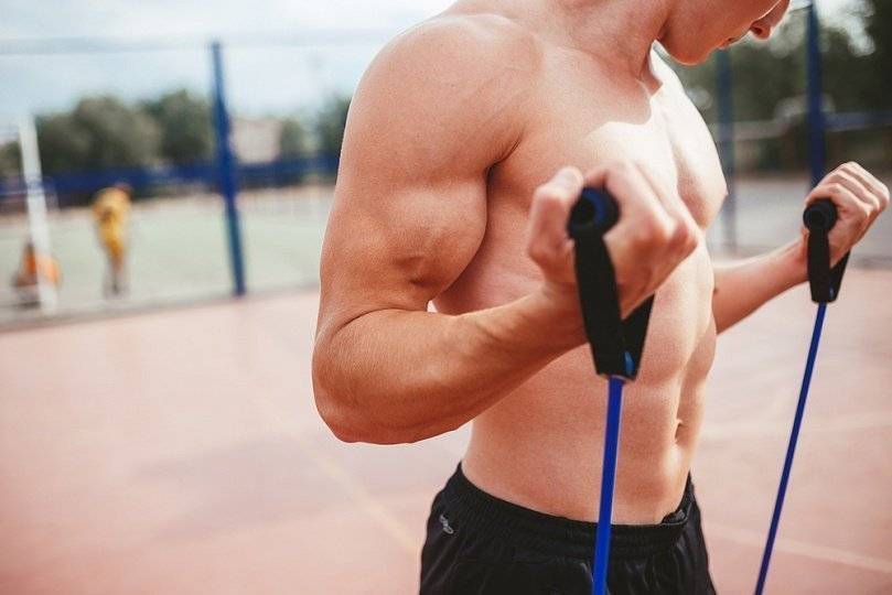 - Сгибание рук для прокачки бицепса. Необходимо ровно встать стопами на эспандер, выпрямить спину. Взять в руки ручки спортивного снаряда и тянуть на себя, сгибая руки в локтях.