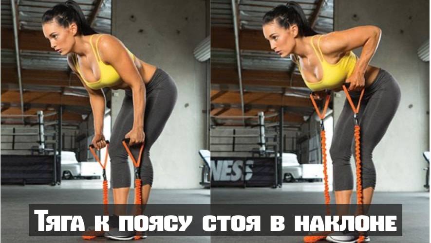 - Ступнями наступаем на резину. Делаем один оборот резиной вокруг одной ступни. Держим ручки. Ноги должны быть согнутыми в коленях, а торс наклонен вперед на 50 градусов, руки прямыми. Напрягаем мышцы поясницы. Разгибаем ноги и спину, сохраняя изгиб позвоночника. Делаем выдох. Постепенно возвращаемся в исходное положение. Делаем вдох.