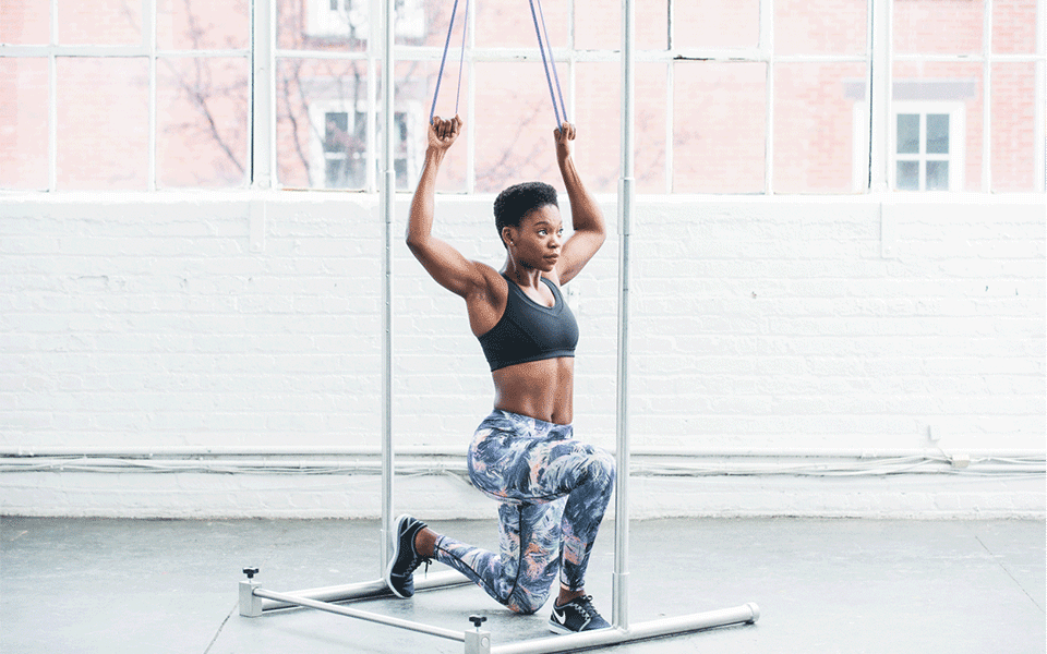 - Крепим тренажер к стене в верхней части. Беремся за его ручки. Опускаемся на одно колено. Тянем ручки на себя до тех пор пока не будет прямой угол в локтях. Задерживаемся в таком положении на 2 секунды. Делаем выдох. Медленно возвращаемся в исходное положение, делаем вдох.