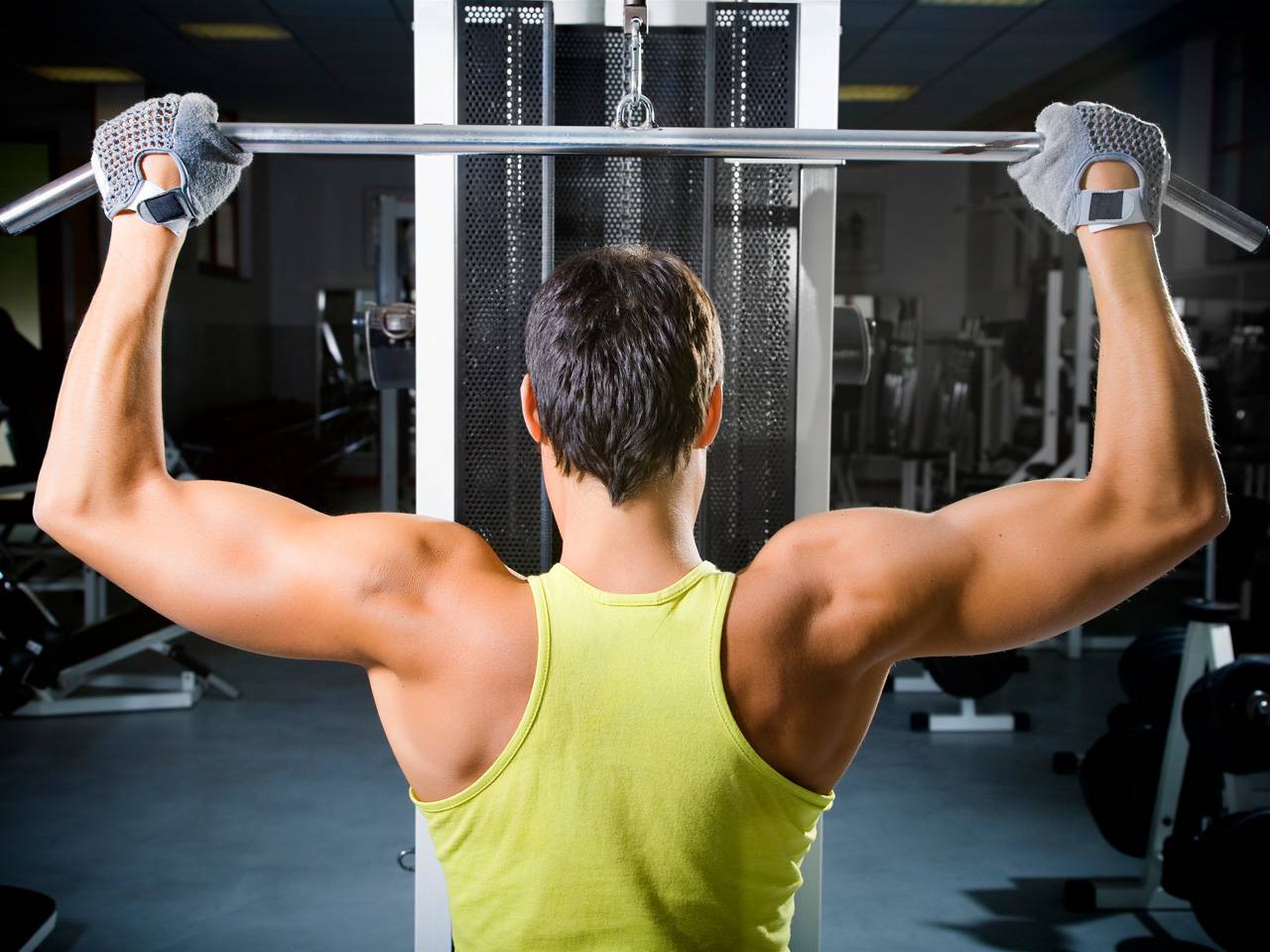 Фото 9. Упражнение на прокачку мышц спины и трицепсов на силовом тренажере.