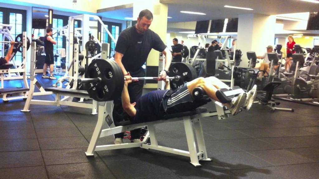 Выполнение жима штанги на отрицательно наклоненной скамье (наклон 45 градусов к горизонту, верхняя часть тела ниже, чем нижняя) создает дополнительную нагрузку на нижнюю часть груди, поэтому рабочие веса также должны быть меньше, чем при горизонтальном жиме, и примерно равны таковым, когда упражнение выполняется на положительно наклоненной скамье.