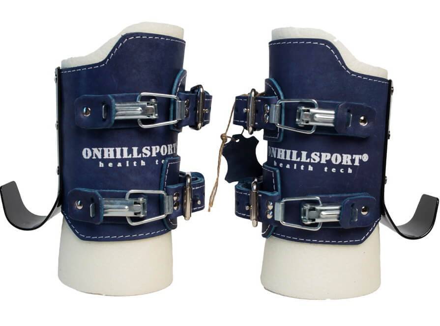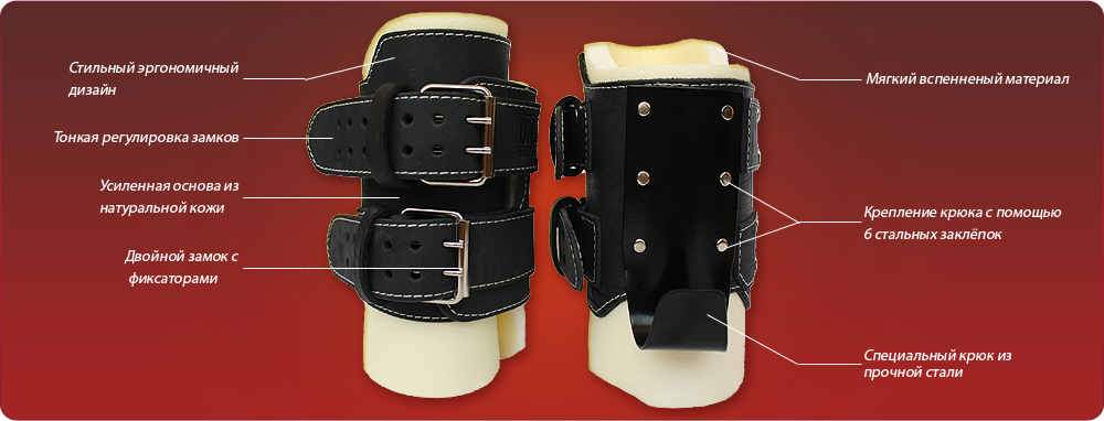 Гравитационные ботинки – это широкие распахивающиеся манжеты, выполненные преимущественно из кожи с надежными защелками, которые плотно охватывают лодыжки. Манжеты снабжены металлическими крюками-зацепами, с помощью которых они крепятся на поперечной перекладине. Внутреннюю поверхность часто покрывают мягким материалом для дополнительного комфорта, равномерного распределения веса.