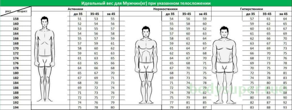 С учетом этого параметра рекомендуется не менять результаты только для нормостенического типа. Людям с астеническим телосложением нужно вычесть 10%, а с гиперстеническим – прибавить 10%.