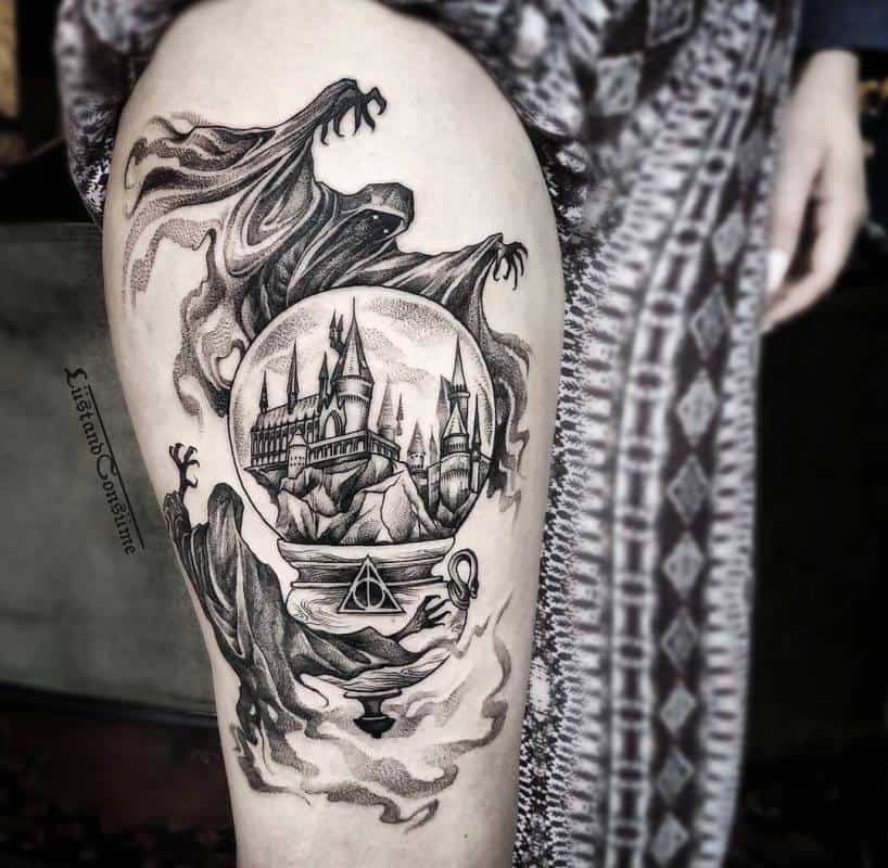 The are many versions of the Hogwarts School of Witchcraft … this Harry Potter tattoo will go well with that dress.
