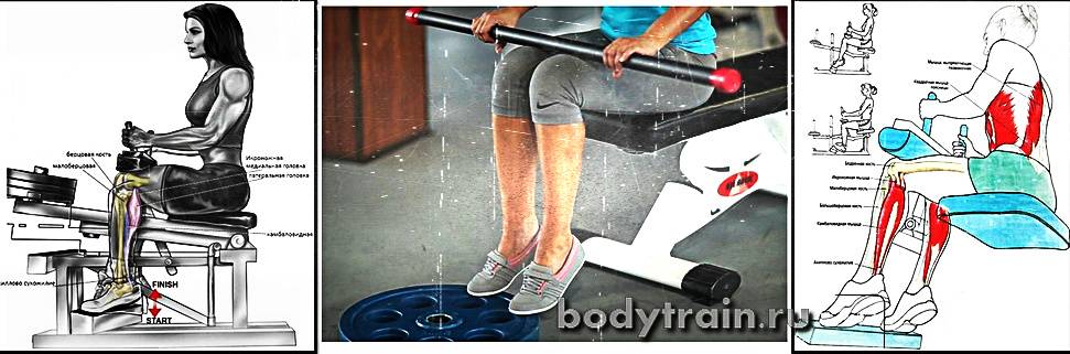 Вторым упражнением станут подъемы на носки сидя. Лучшим вариантом будет использование специального тренажера. Если такого в Вашем зале нет – не отчаивайтесь. Подложите под носки брусок, чтобы пятки могли уходить ниже горизонтали, возьмите гантели или штангу, сядьте на скамью и расположите отягощение на коленях. Принципы выполнения здесь абсолютно такие же, как и в подъемах ног на носки стоя.