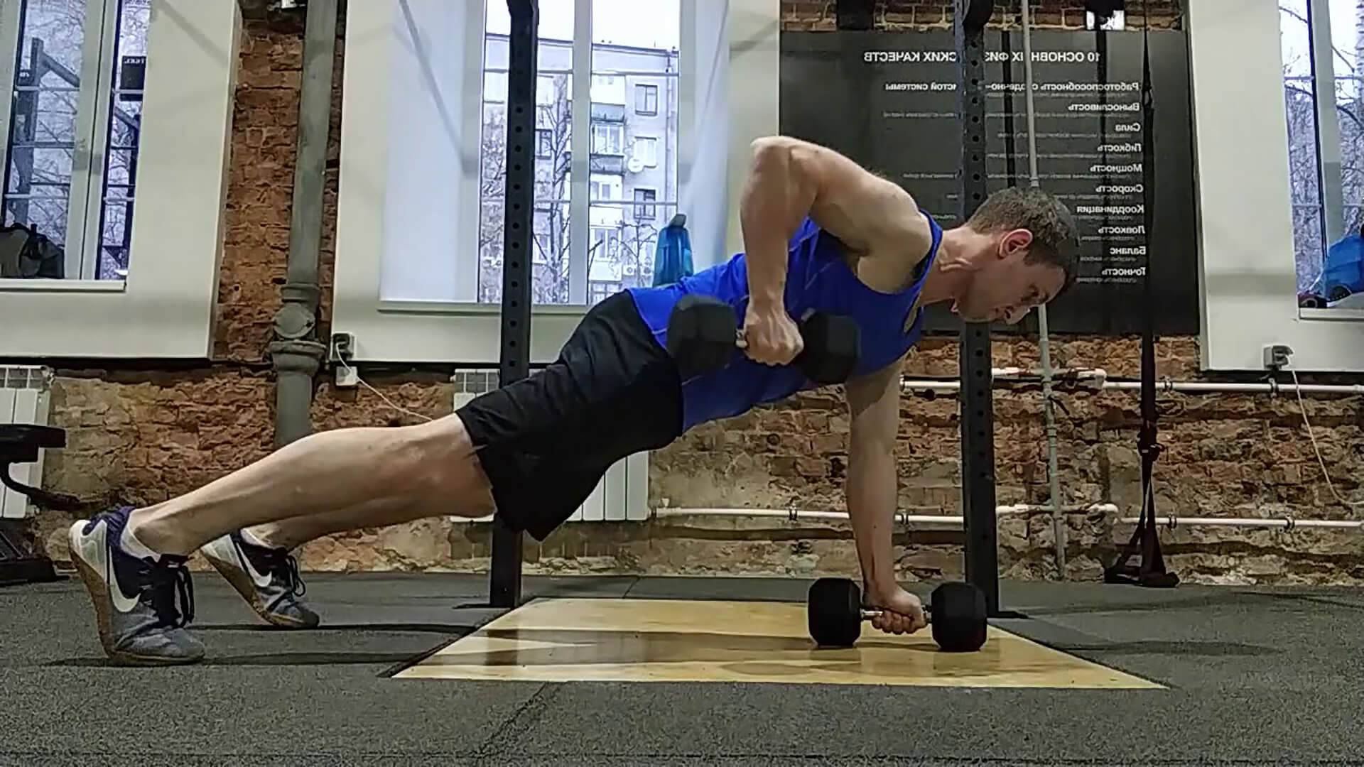 - В среднем темпе начинайте протягивать одну гантель к туловищу. В верхней точке амплитуды гантель должна располагаться на уровне мышц пресса. На пике движения следует выдержать паузу и только потом вернуть вес в исходное положение.