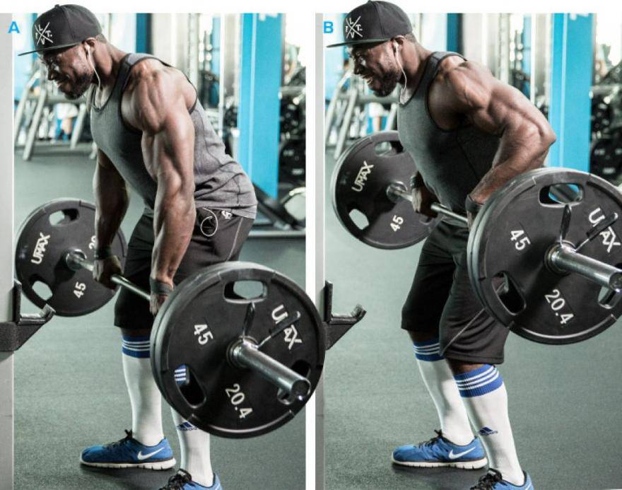 Тяга штанги в наклоне. Более тяжелая версия подтягиваний, которая отличается строгой техникой выполнения и большими весами. Основная нагрузка приходится на широчайшие; в зависимости от угла наклона и ширины хвата можно проработать как толщину, так и ширину спины. Отлично прорабатывает низ!