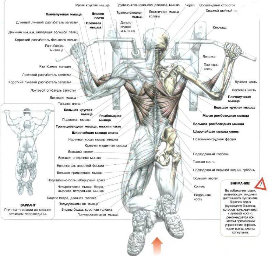 Первое, что нас может заинтересовать — это подтягивания. Многие ошибочно считают, что здесь мы в первую очередь задействуем руки, но это не так.