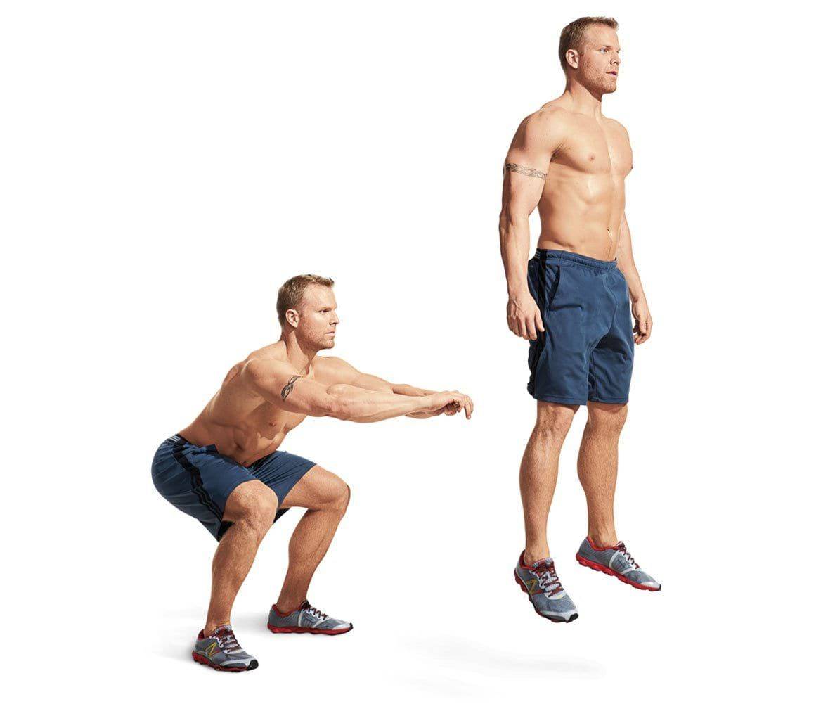 Установите ноги немного шире плеч, выполните присед, пока верхняя часть ног не будет параллельна полу, после чего прыгните как можно выше. Выполните сгибание колен на 45°, когда вы приземлитесь, сделайте паузу в таком положении на секунду, а затем снова прыгайте.