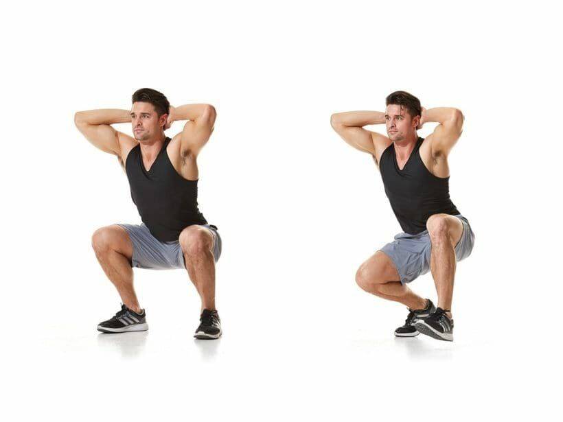 - Приседания без веса. 2 разминочных подхода по 15-20 раз.