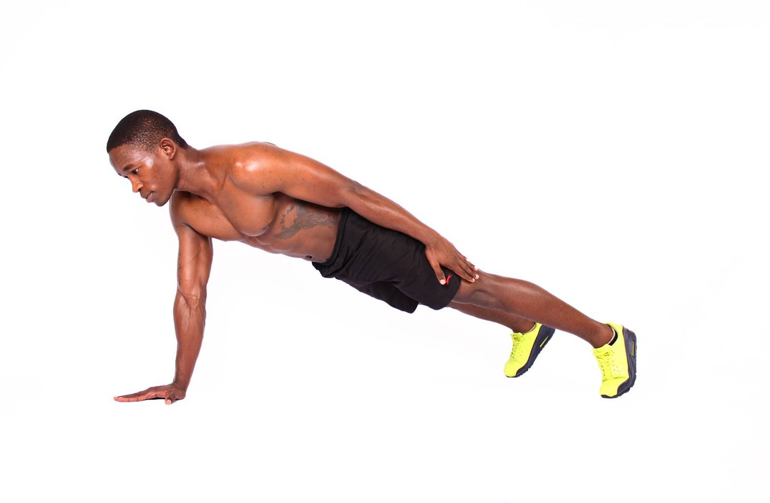 - Исходная позиция (ИП) – упор лежа, руки поставьте немного шире плеч, ноги соедините, спина прямая (не выгибайте). Потом немного поднимите одну ногу и начинайте отжиматься.